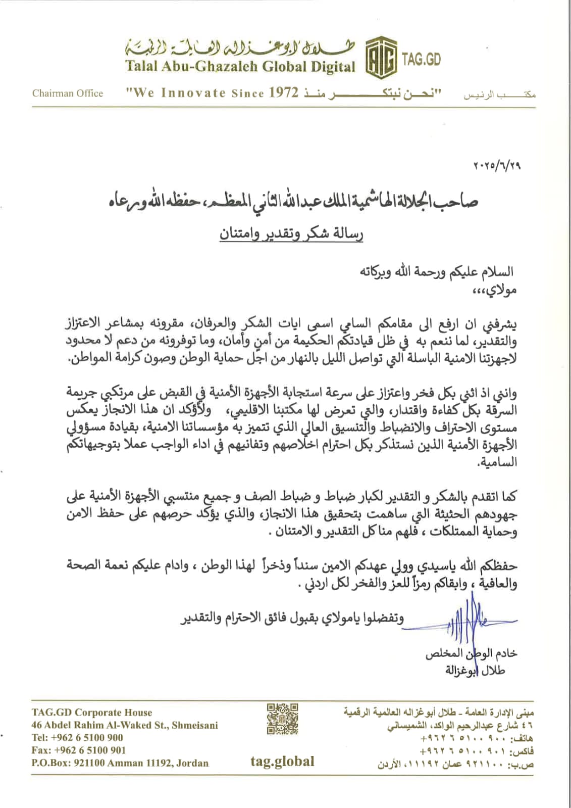 عمّان – وجّه سعادة الدكتور طلال أبوغزاله، رئيس ومؤسس مجموعة طلال أبوغزاله العالمية، رسالة شكر وامتنان إلى جلالة الملك عبد الله الثاني ابن الحسين، مشيدًا بقيادته الحكيمة التي جعلت من الأردن نموذجًا في الأمن والاستقرار على مستوى المنطقة العربية.