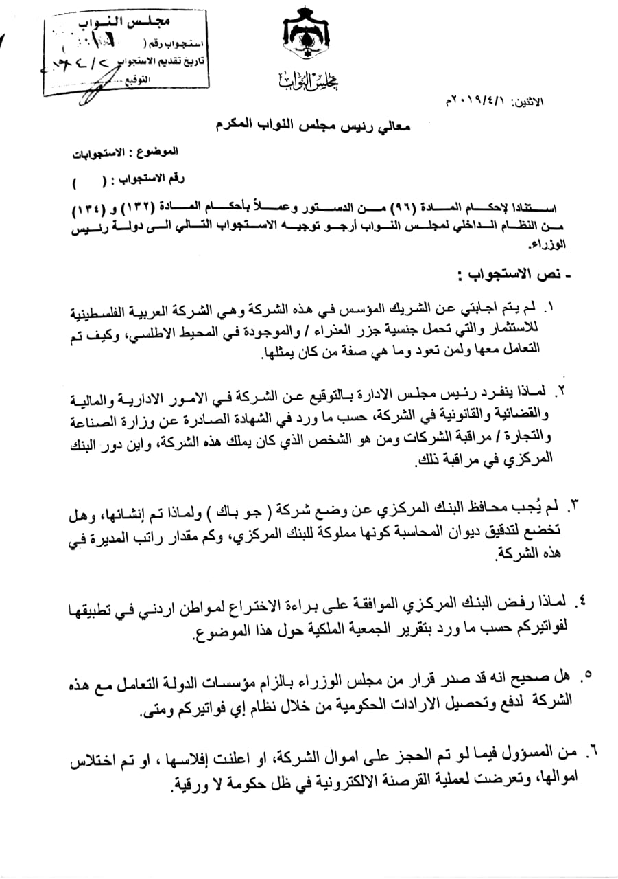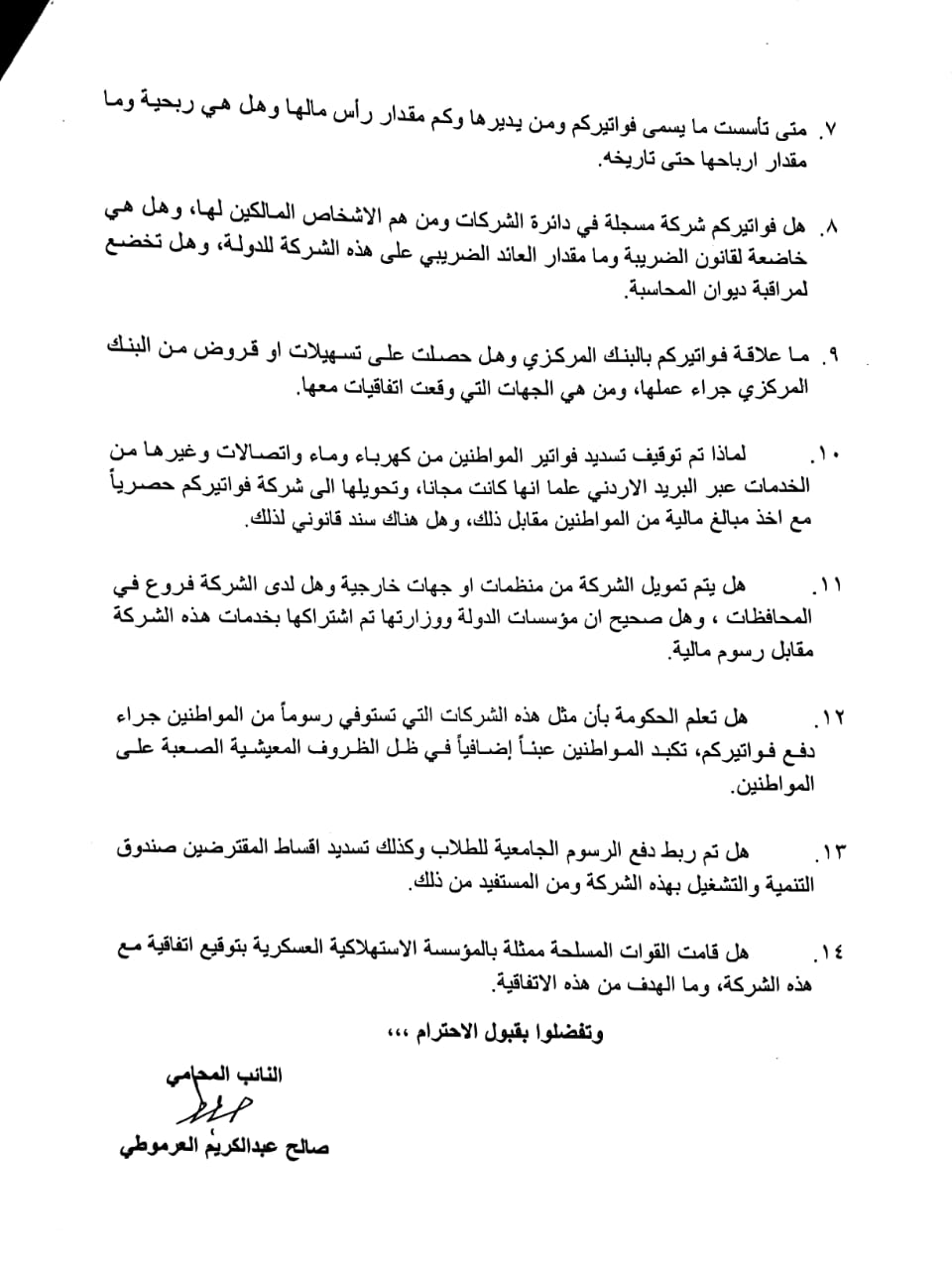 وطلب العرموطي، في السؤال ، معرفة اذا كانت شركة فواتيركم شركة مسجلة في دائرة الشركات ومن هم الاشخاص المالكين لها، وهل هي خاضعة لقانون الضريبة وما مقدار العائد الضريبي على هذه الشركة للدولة، وهل تخضع لمراقبة ديوان المحاسبة.