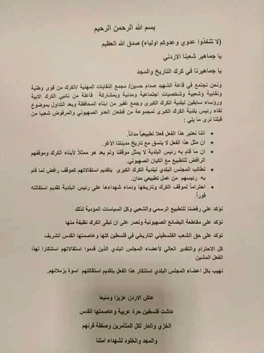 وقد اجمع الحضور على اصدار بيان بإسم ابناء المحافظة يستنكر ما قام به رئيس بلدية الكرك .. معتبرين ان ما قام به يعتبر فعلا تطبيعيأ مداناً .. وان مثل هذا الفعل لا يتسق مع تاريخ المدينة الاغر .. ومؤكدين على ان ما قام به رئيس البلدية لا يمثل موقف ابناء المحافظة وان رئيس البلدية لم يعد ممثلاً لهم بموقفهم الرافض للتطبيع مع الكيان الصهيوني .