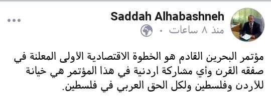 وكتب الحباشنة : "مؤتمر البحرين القادم هو الخطوة الاقتصادية الأولى المعلنة في صفقة القرن .. واي مشاركة أردنية في هذا المؤتمر هي خيانة للاردن وفلسطين ولكل الحق العربي في فلسطين" .