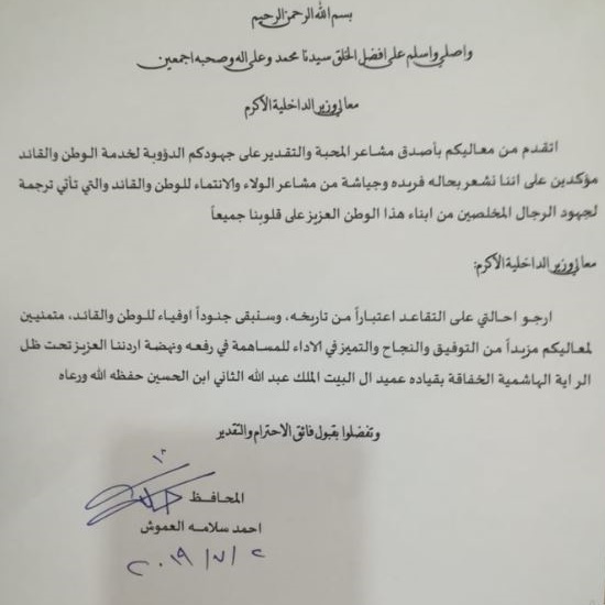 وفي نص الكتاب الموجه من العموش لوزير الداخلية .. كتب العموش : "معالي وزير الداخلية ارجو احالتي على التقاعد اعتباراً من تاريخه ، وسنبقى جنوداً اوفياء للوطن والقائد ، متمنين لمعاليكم مزيداً من التوفيق والنجاح والتميز في الاداء للمساهمة في رفعة ونهضة أردننا العزيز تحت ظل الراية الهاشمية الخفاقة بقيادة عميد ال البيت الملك عبدالله الثاني ابن الحسين حفظه الله ورعاه" .