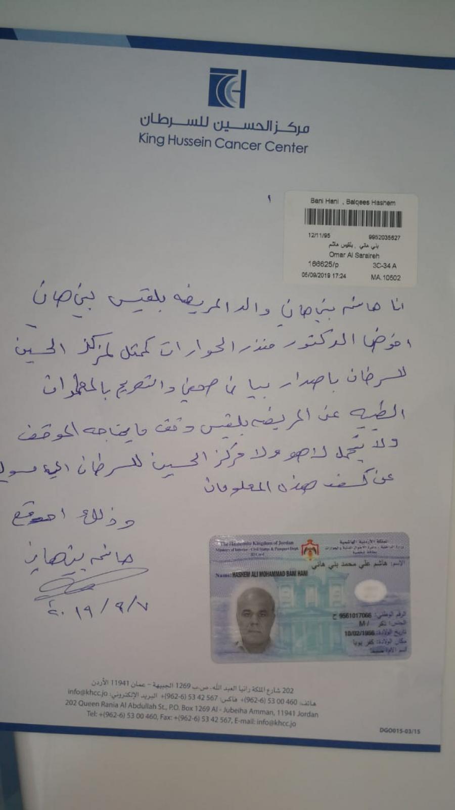 اصدر مركز الحسين للسرطان بياناً هاماً حول حالة المريضة بلقيس بني هاني التي تعاني من ورم سرطاني و قد اشغلت حالتها مواقع التواصل الاجتماعي .