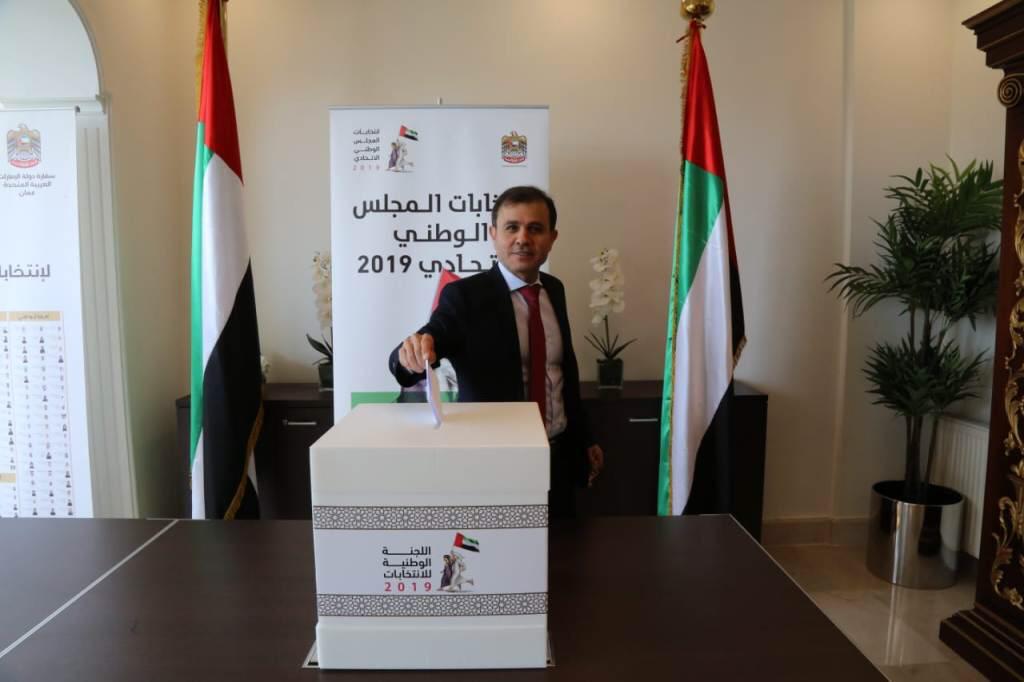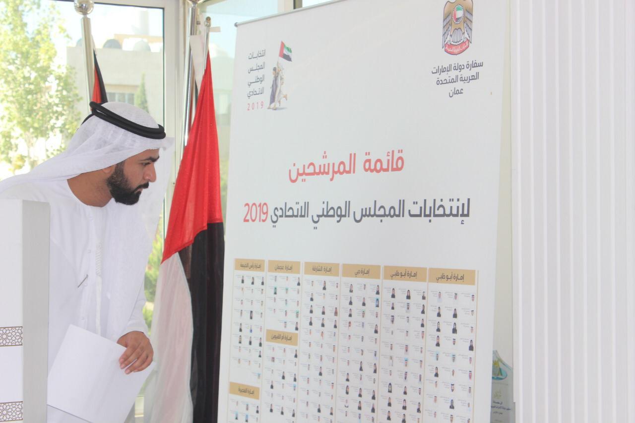 شهدت سفارة الإمارات في عمّان منذ صباح يوم الأحد الموافق 22/9/2019 توافد مواطني دولة الإمارات العربية المتحدة المتواجدين في المملكة الأردنية الهاشمية، للإدلاء بأصواتهم في إنتخابات المجلس الوطني الإتحادي 2019.