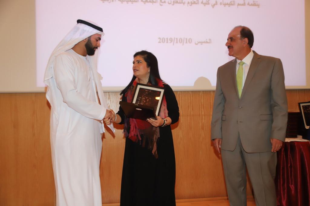 وكرمت سمو الأميرة في ختام فعاليات مؤتمر، حمل عنوان "خمسة عقود من الكيمياء في الأردن التحديات والإنجازات"، والذي نظمه قسم الكيمياء في كلية العلوم بالجامعة الأردنية بالتعاون مع الجمعية الكيميائية الأردنية، السيد فهد العتيبي سكرتير ثالث بسفارة دولة الإمارات بالأردن وممثلاً عن صندوق ابوظبي للتنمية، كما كرمت داعمي قسم الكيمياء في الجامعة، وقدامى أعضاء الهيئة التدريسية في القسم، وداعمي الجمعية الكيميائية الأردنية، وداعمي المؤتمر.