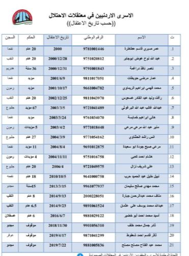 3): تزويدي بكامل التفاصيل عن الأسرى الأردنيين والمفقودين في معتقلات الاحتلال وما اتخذ من اجراء بحقه كلٌ على حدة ومرفقاً بطيه الأسرى الأردنيين المعتقلين ؟