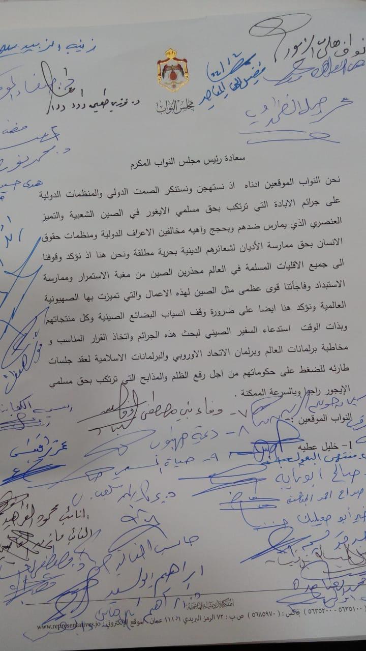 نحن النواب الموقعين ادناه اذ نستهجن ونستنكر الصمت الدولي والمنظمات الدولية على جرائم الابادة التي ترتكب بحق مسلمي الايغور في الصين الشعبية والتميز العنصري الذي يمارس ضدهم وبحجج واهيه مخالفين الاعراف الدولية ومنظمات حقوق الانسان بحق ممارسة الأديان لشعائرهم الدينية بحرية مطلقة ونحن هنا اذ نؤكد وقوفنا الى جميع الاقليات المسلمة في العالم محذرين الصين من مغبة الاستمرار وممارسة الاستبداد وفاجأتنا قوى عظمى مثل الصين لهذه الاعمال والتي تميزت بها الصهيونية العالمية ونؤكد هنا ايضا على ضرورة وقف انسياب البضائع الصينية وكل منتجاتهم وبذات الوقت مخاطبة برلمانات العالم وبرلمان الاتحاد الاوروبي والبرلمانات الاسلامية لعقد جلسات طارئه للضغط على حكوماتهم من اجل رفع الظلم والمذابح التي ترتكب بحق مسلمي الإيجور راجيا وبالسرعة الممكنة .