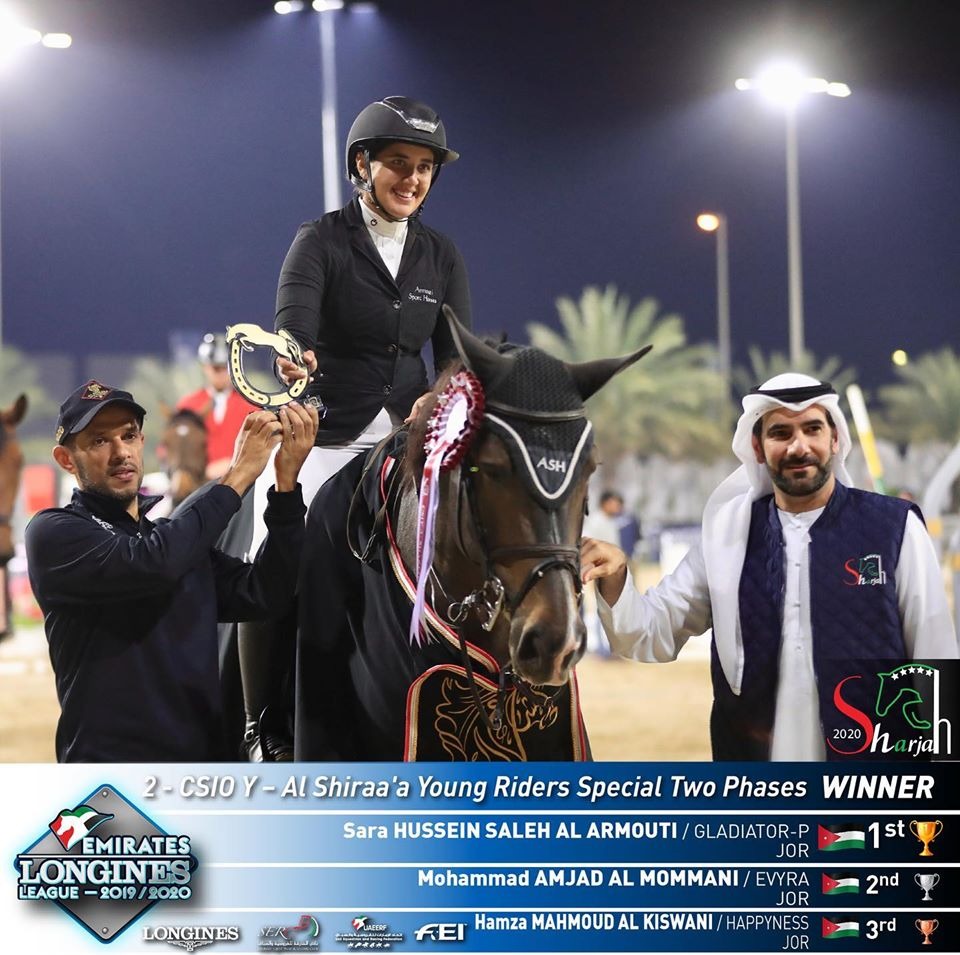 توج فرسان منتخب الفروسية للشباب بالمراكز الثلاث الاولى حيث حلت الفارسة سارة العرموطي بالمركز الاول ،فيما حل الفارس محمد المومني ثانيا ،والفارس حمزة الكسواني ثالثا فيما فاز ضمن مرحلة الاطفال الفارس محمد ابو حمور بالمركز الثاني ضمن تصفيات المجموعة السابعة المؤهلة لكأس العالم التي تقام في الشارقة بالتعاون مع نادي الشارقة واتحاد الفروسية الاماراتي والاتحاد الدولي للفروسية.