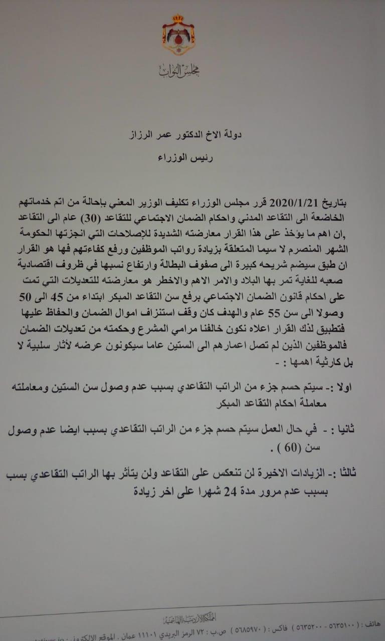 و عليه فالعودة عن الاجتهاد (قرار مجلس الوزراء ) الذي جانب الصواب فضيله وسنه حميدة تشكر عليها الحكومة ولما ذكر اطالب وبالسرعة المكنه تدارك ذلك القرار بإلغاء القرار واستمرار الموظفين على رأس عملهم لحين وصول الستين وبالتناوب عدم تطبيق نظام التقاعد المبكر وعدم الحسم من الراتب التقاعدي بسبب العمر لا سيما وان الإحالة تمت بموجب قرار مجلس الوزراء وليس بناء على طلب الموظفين وبذات الوقت استثناؤهم من عدم السماح لهم بالعمل وعدم اقتطاع اي جزء من الراتب التقاعدي وان تظهر الزيادة الاخير ة على رواتبهم التقاعدية وقبل ان اختم اتمنى على الحكومة ان لا تكون اتخذت قرارات بهدف التحلل من مسؤولياتها الاهم وهي تحفيز الاقتصاد لتوليد فرص العمل لا ان تتم التعينات على حساب اسر قد تتهدم مشددا على الكثير من مؤسسات الدولة تعاني من نقص في الكوادر الفنية متمنيا وداعيا لكم بمزيد من التقدم والازدهار في ظل حضرة صاحب الجلالة الهاشمية الملك عبد الله الثاني حفظه الله ورعاه