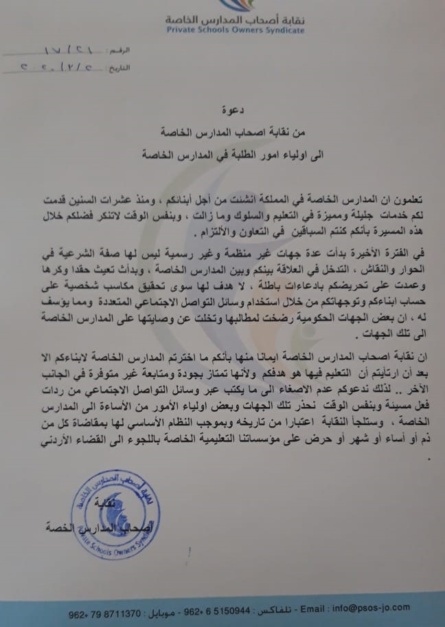 فـ على ضوء الحملة الشرسة التي يقودها بعض الحاقدين على التعليم الخاص اصدرت نقابة اصحاب المدارس الخاصة اليوم الاثنين 2/3/2020 بيان لأهالي الطلبة قالت فيه ان هنالك ثمة جهات غير منظمة وغير رسمية ليس لها صفة الشرعية في الحوار والنقاش و تعمل على التحريض والاسائة للمدارس الخاصة عبر وسائل التواصل الأجتماعي المتعددة , ومن المؤسف ان بعض الجهات الحكومية رضخت لمطالبها وتخلت عن وصايتها على المدارس الخاصة الى تلك الجهات .
