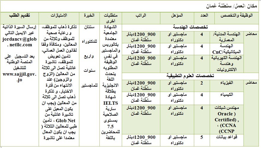 تعلن مديرية التشغيل المركزية في وزارة العمل عن توفر (198) فرصة عمل في الاردن وعدد من الدول العربية المبينة في الجدول ادناه، موزعين كالتالي : سلطنة عُمان 60 فرصة عمل ، الإمارات العربية المتحدة 30 فرصة عمل، ( مطعم الكلحة) 15 فرصة عمل في قطر و3 فرص في الاردن_ فرع دابوق، 57 فرصة عمل في شركة تكنولوجيا المعلومات ومستشفى اربد التخصصي الأردن، ومطعم في اربد ، شركة ابو غزالة 33 فرصة عمل في كل من اوزبكستان، الاردن ،القاهرة ،السودان المغرب، سوريا، العراق، البحرين، قطر .
