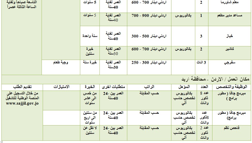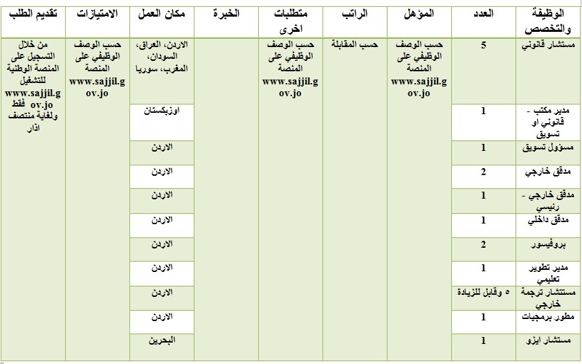 ودعت مديرية التشغيل المتقدمين الراغبين بالعمل الدخول على المنصة الوطنية للتشغيل www.sajjil.gov.jo ،والتسجيل عليها. وتقديم طلبات العمل حسب البريد الالكتروني المبين إزاء كل فرصة عمل.