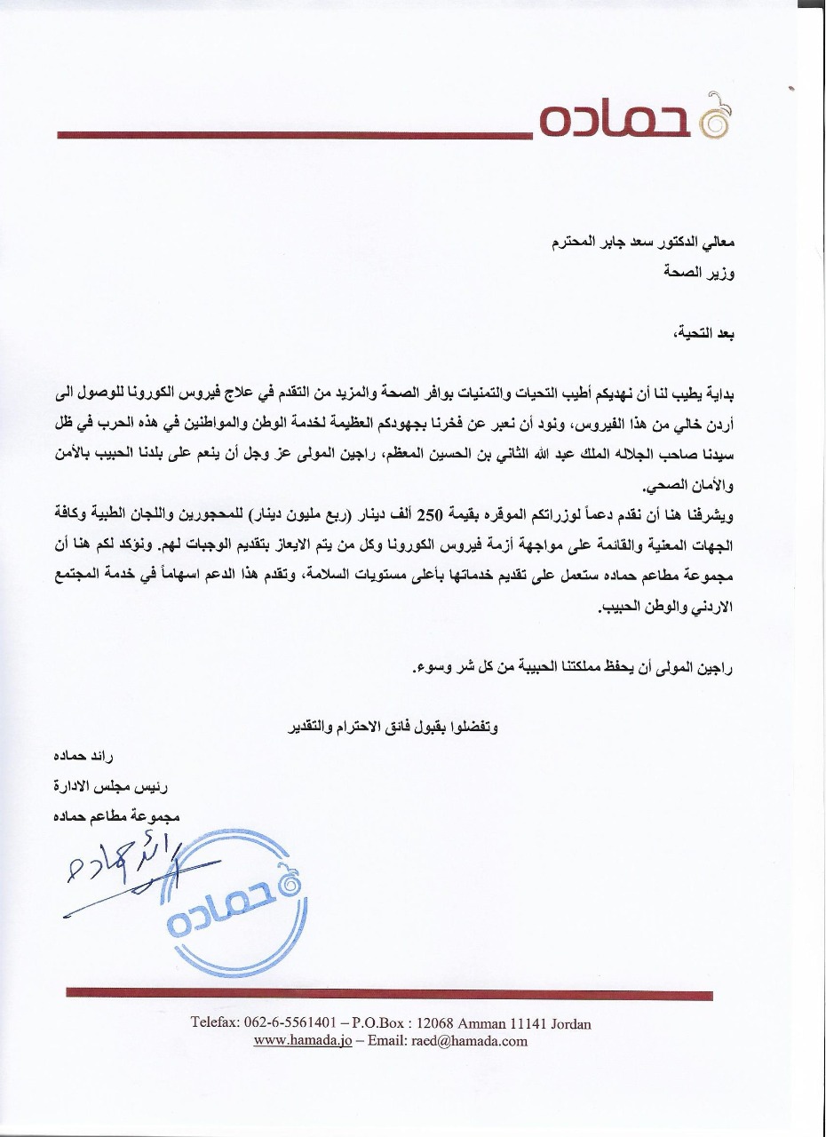 مجموعة مطاعم حمادة تتبرع بربع مليون دينار لمكافحة فيروس كورونا المستجد
