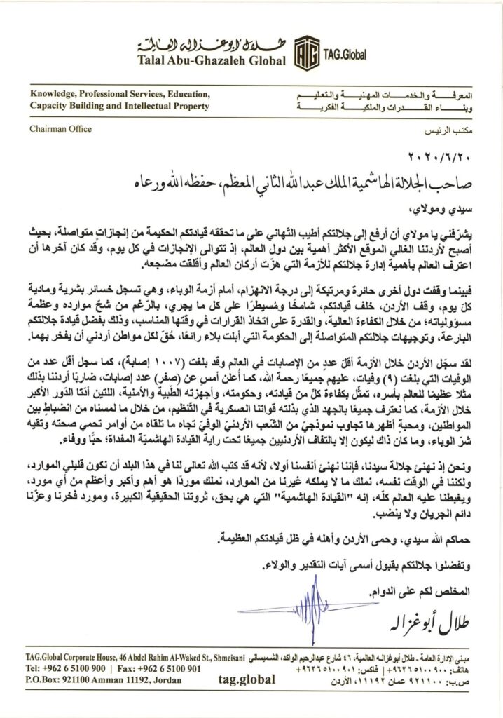رفع الدكتور طلال ابو غزالة رئيس مجلس ادارة مجموعة طلال ابو غزاله العالمية رسالة شكر وتقدير الى جلالة الملك عبدالله الثاني بن الحسين على ما حققته وتحققه قيادة الملك الحكيمة من انجازات كان اخرها اعتراف العالم بأهمية ادارة الملك لأزمة كورونا التي هزت اركان العالم