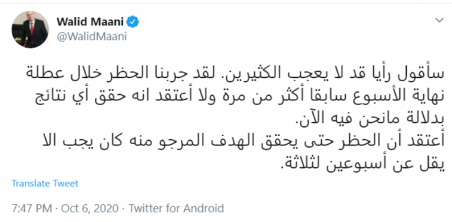 وقال المعاني عبر تويتر " سأقول رأياً قد لا يعجب الكثيرين. لقد جربنا الحظر خلال عطلة نهاية الأسبوع سابقاً أكثر من مرة ولا أعتقد أنه حقق أي نتائج بدلالة ما نحن فيه الآن".
