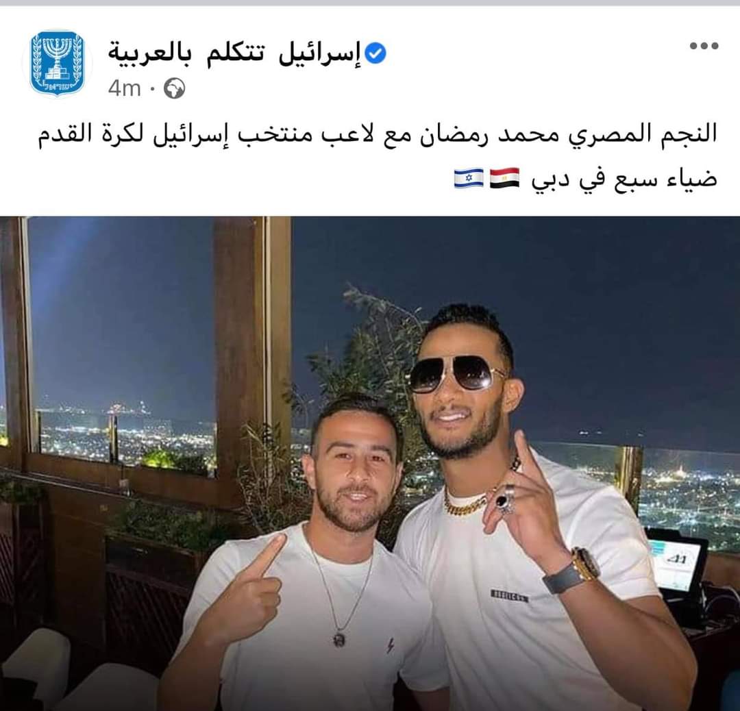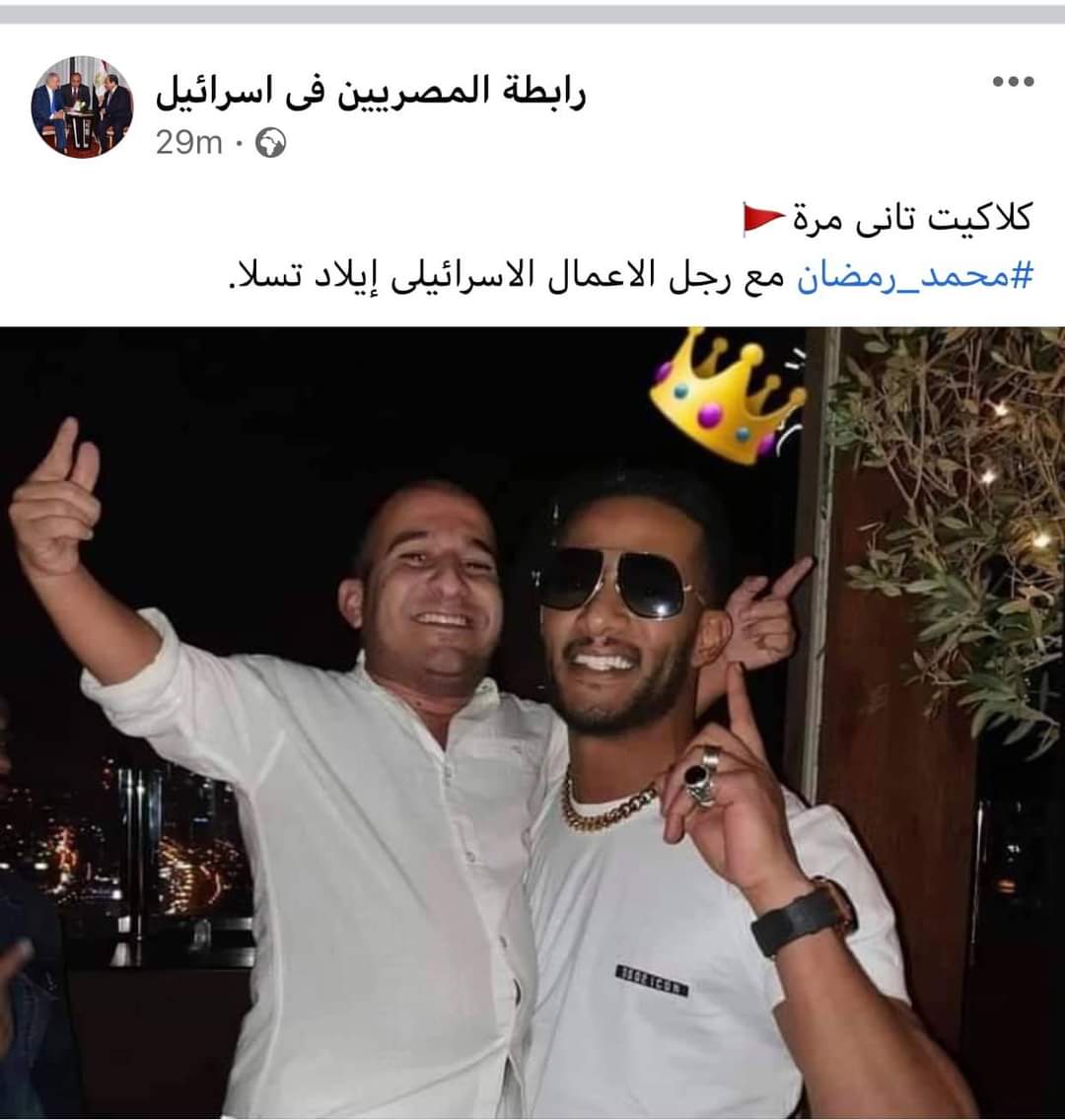 وأثار محمد رمضان، أمس السبت، ضجة كبيرة، بعدما نشر المغرد الإماراتي حمد المزروعي صورة أظهرته إلى جانب محمد رمضان وهو يعانق المطرب الإسرائيلي عومير آدام، كما نشر مطرب إسرائيلي آخر إلعاد تسفاني، صورة جديدة على حسابه بموقع انستغرام لرمضان وهو يعانقه، معلقاً بكلمة "الملك".