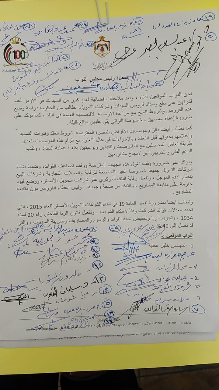 نحن النواب الموقعين أدناه، وبعد ملاحقات قضائية لعددٍ كبير من السيدات في الأردن لعدم قدرتهن على دفع وسداد قروض السيدات وشركات التمويل، نطالب من الحكومة دراسة وضع هذه القروض وشروط المنح مع مراعاة الأوضاع الاقتصادية العامة في البلد، كما نؤكد على ضرورة إعفاء بعضهن، خصوصًا اللواتي بقي عليهن مبالغ قليلة.