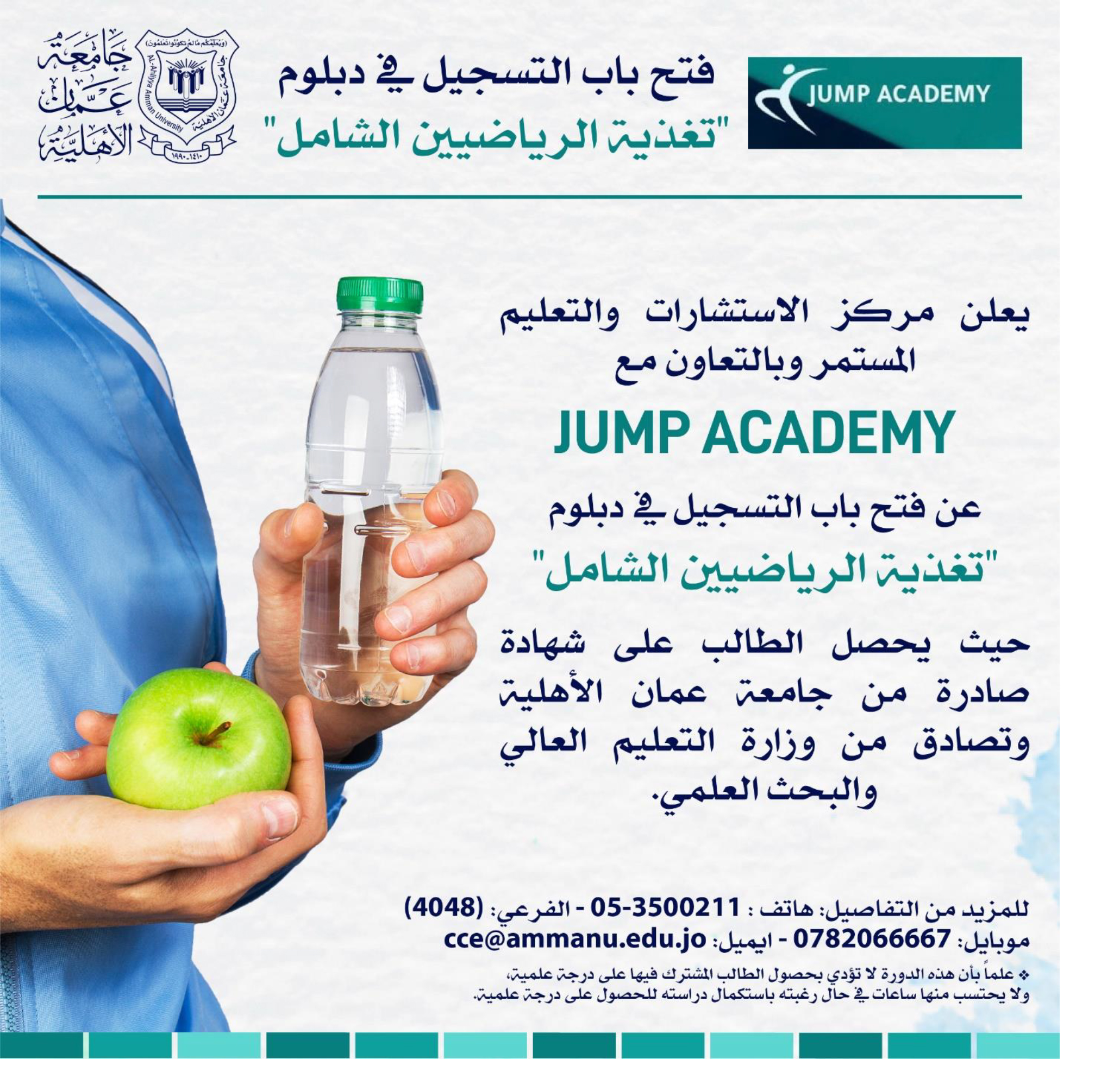 يعلن مركز الاستشارات والتعليم المستمر في جامعة عمان الأهلية وبالتعاون مع Jump Academy عن فتح باب التسجيل في دبلوم "تغذية الرياضيين الشامل". للمزيد من التفاصيل يرجى الاطلاع على البروشور المرفق، أو التواصل على الرقم: 0782066667 / معاذ الرواشدة.