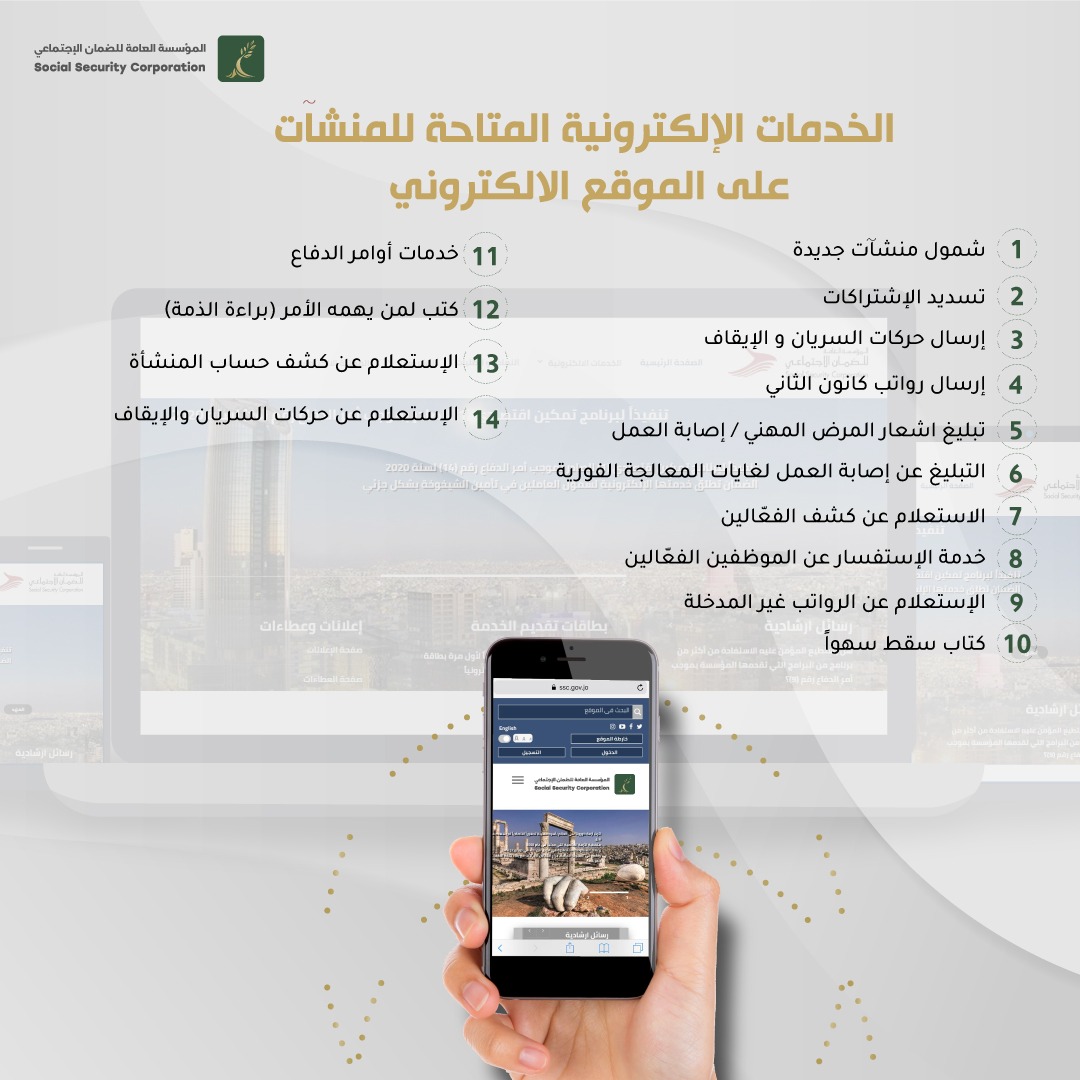 وبيّنت المؤسسة بأنه يمكن الاستفادة من أدلة الاستخدام المتوفرة على موقع المؤسسة الإلكتروني على زاوية (المكتبة الإلكترونية) أو الاطلاع على الفيديوهات التي توفرها المؤسسة على قناتها في اليوتيوب على الرابط (https://www.youtube.com/channel/UCmzVv-X8RmLUYujy9pf1HsA) أو التواصل معها من خلال مواقع التواصل الاجتماعي الخاصة بها (الفيس بوك وتويتر وانستغرام)، أو على بريدها الرسمي webmaster@ssc.gov.jo أو من خلال موقعها الإلكتروني www.ssc.gov.jo.