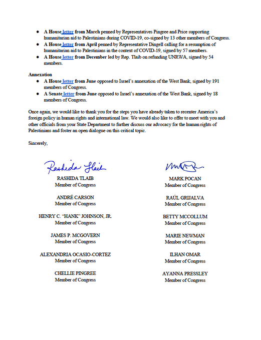 وصاغ الرسالة كل من النائبة الفلسطينية الأصل، رشيدة طليب (عن ولاية ميشيغان) والنائب مارك بوكان (ديمقراطي عن ولاية ويسكونسن).