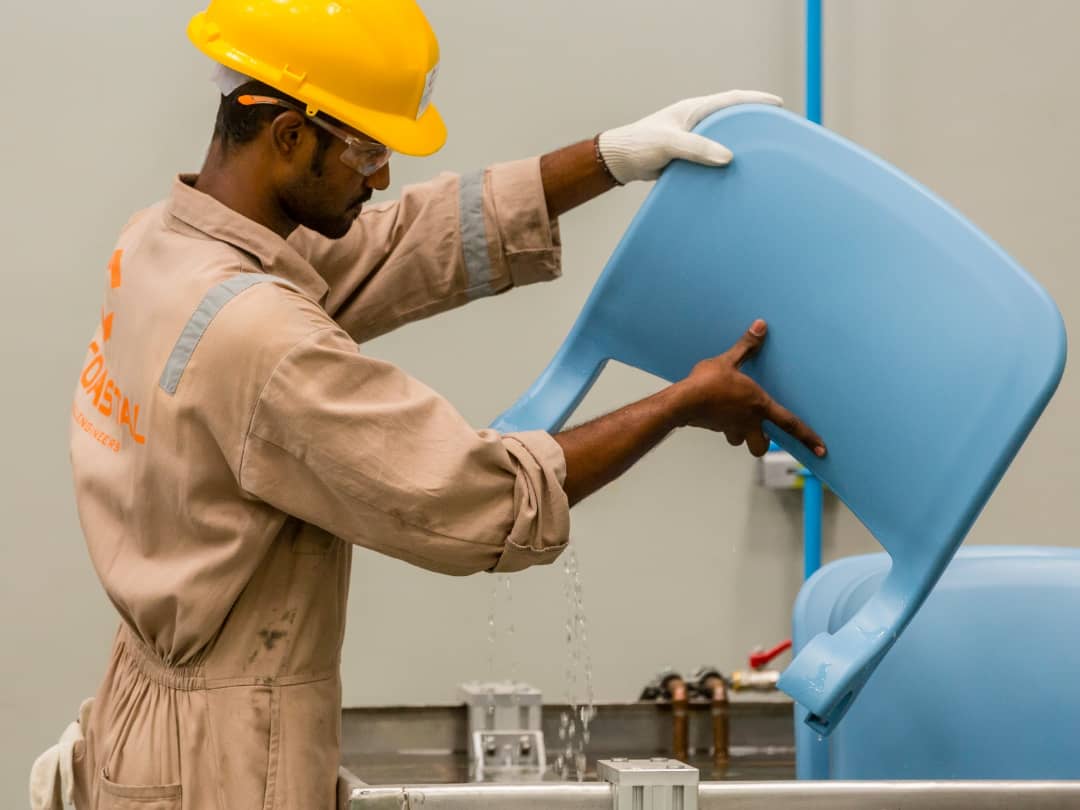 وأكد عظيم أن كوستال قطر تسير على خطى اللجنة العليا في الالتزام بالممارسات المستدامة خلال تصنيع مقاعد الاستادات، وتجنّب أي هدر في البلاستيك، وقال: "في حال عدم حصول المقاعد المصنّعة على الاعتماد اللازم، أو الحاجة إلى تغيير الألوان؛ فإننا نعيد تدويرها، وفي بعض الأحيان يخرج المنتج النهائي في شكل مقاعد مختلطة الألوان، ولدى الشركة فريق متكامل يتولى كافة مراحل التصنيع."