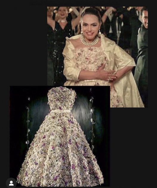 ولفتت شريهان الكثير من الأنظار بإطلالتها. ومن خلال البحث، تبين أنها ارتدت فستاناً من توقيع المصمّم العالمي Chiristian Dior، وأنه عرضه ضمن مجموعة ربيع وصيف 1949.