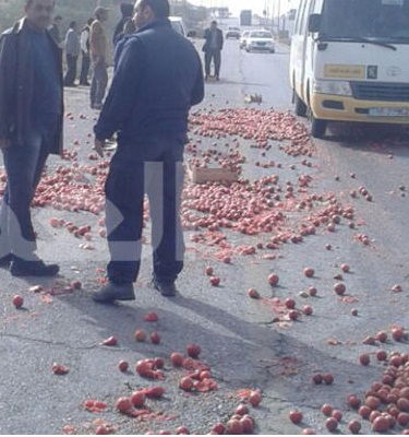 أقدم مزارعون في الأغوار الجنوبية على إلقاء ثمار البندورة في أحد الشوارع الرئيسية، اليوم الثلاثاء، احتجاجا على انخفاض أسعارها.
