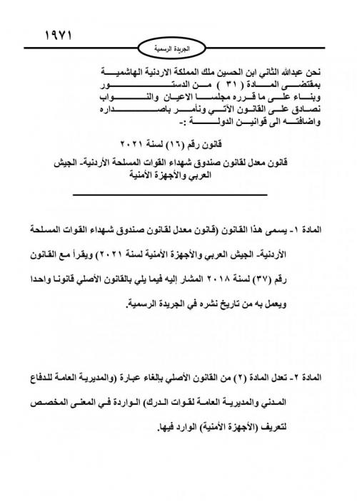 صدر في عدد الجريدة الرسمية اليوم الثلاثاء القانون معدل لقانون صندوق شهداء القوات المسلحة الأردنية- الجيش العربي والأجهزة الأمنية.