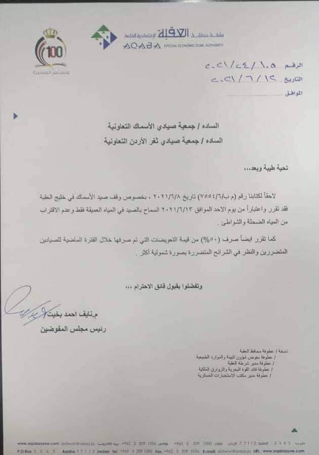 وكانت سلطة منطقة العقبة الاقتصادية الخاصة قد اتخذت قرارا خلال الأسبوع الماضي بتمديد منع الصيد لمدة شهرين إضافيين مما حدى بالصيادين إلى الإعتصام وإطلاق صرخات استغاثة بسبب تضررهم من قرار المنع وبعد مفاوضات مارثونية قامت سلطة العقبة بتعديل القرار السابق بهدف الحفاظ على البيئة البحرية ومنع الصيد الجائر للأسماك خلال فترة تكاثرها. شاهد