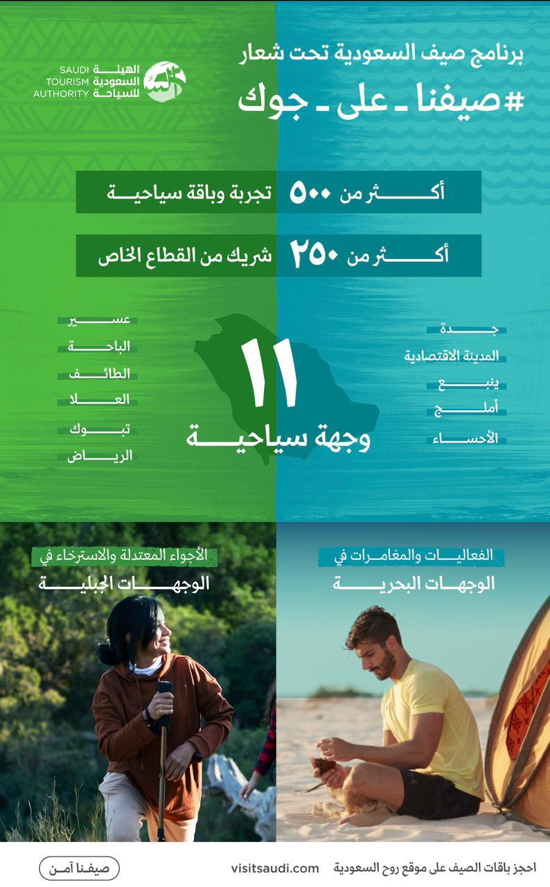 الرياض - الخميس 24 يونيو 2021م: أعلنت الهيئة السعودية للسياحة عبر منصة "روح السعودية" عن إطلاق برنامج صيف السعودية 2021م تحت شعار "صيفنا على جوك" خلال الفترة من 24 يونيو الجاري وحتى نهاية شهر سبتمبر، وذلك في 11 وجهة سياحية غنية بالتنوع الطبيعي والأجواء الرائعة؛ يُقدم من خلالها ما يزيد عن 500 تجربة سياحية؛ عبر أكثر من 250 شريكاً من القطاع الخاص.