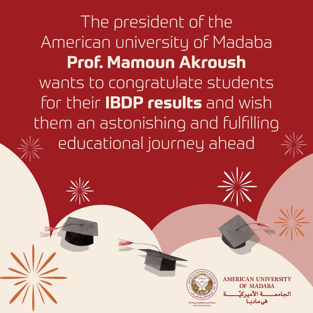 هنأ رئيس الجامعة الامريكية في مادبا الأمريكية الأستاذ الدكتور مأمون عكروش , الطلاب في برنامج دبلوم البكالوريا الدولية (“IBDP“) وتمنى لهم رحلة تعليمية مذهلة وممتعة في المستقبل.