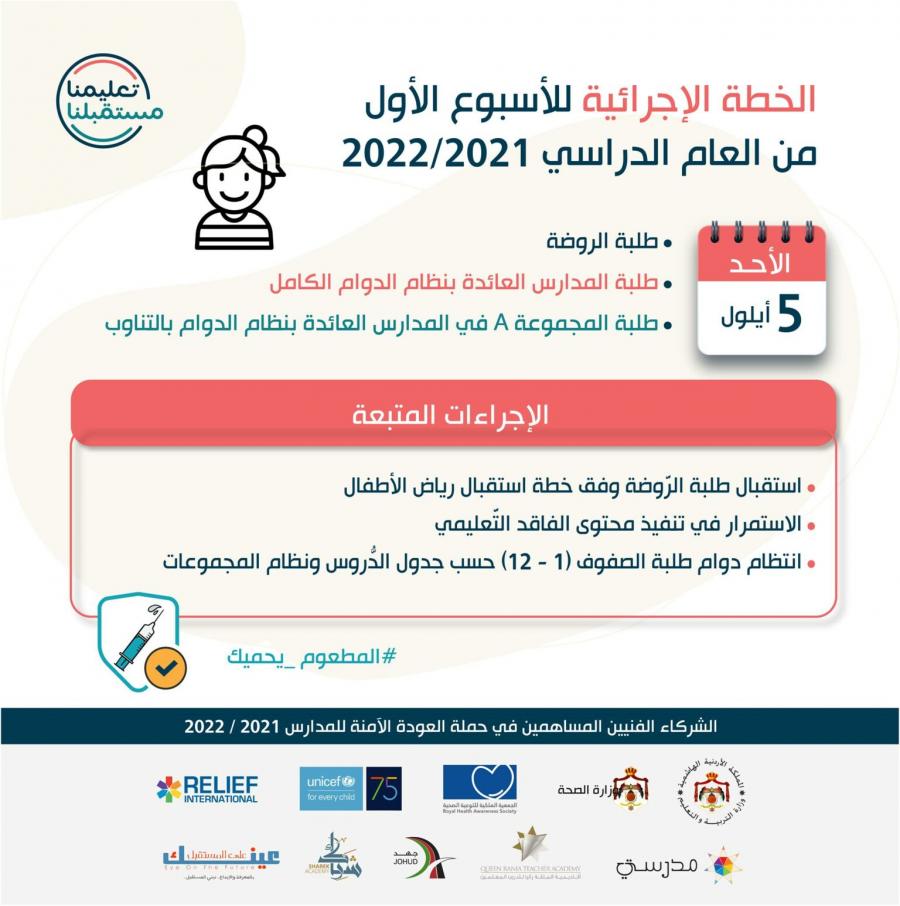 أكدت أمين عام وزارة التربية والتعليم للشؤون الادارية والمالية نجوى قبيلات أنه سيتم استقبال طلبة رياض الأطفال يوم الأحد، الموافق 5 أيلول.