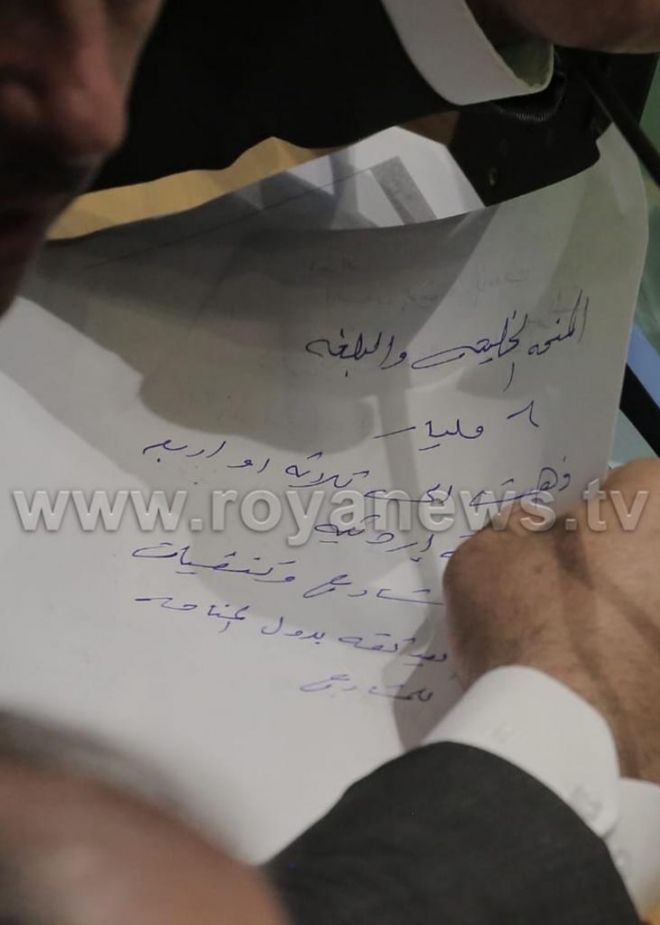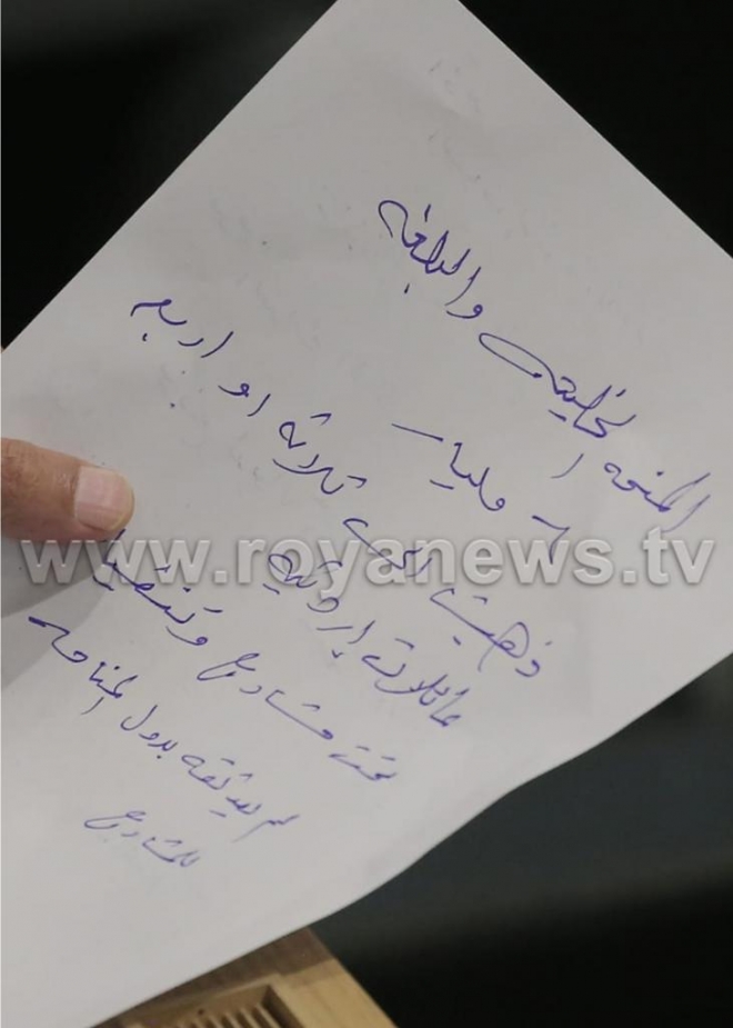 ويظهر في الرسالة يقول فيها النائب إن المنحة الخليجية والبالغة 6 مليارات، ذهبت إلى ثلاث أو أربع أسر أردنية، تحت مشاريع وتنفيعات.