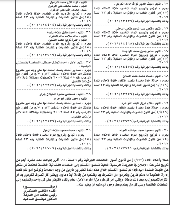 ونشرت المحكمة الخميس، أسماء المتهمين، عملا بأحكام المادة 243 /2 من قانون أصول المحاكمات الجزائية رقم 9 لسنة 1961.