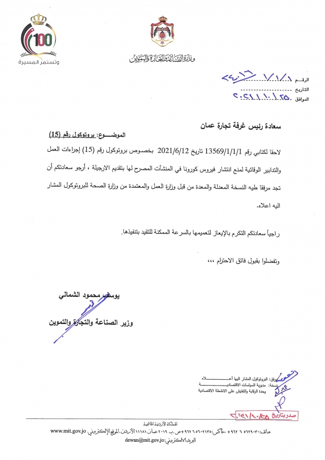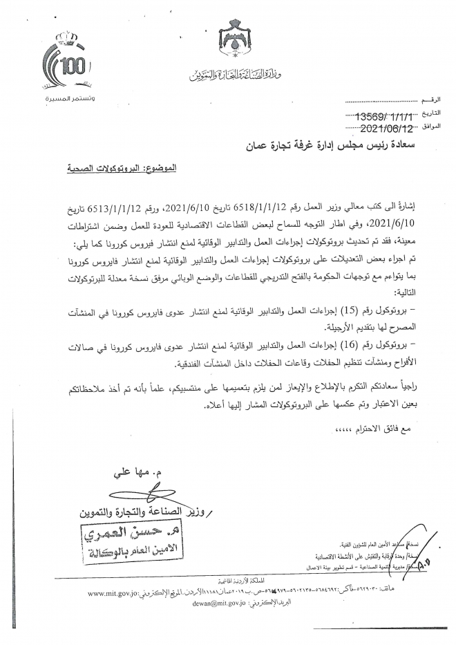 واكد الحاج توفيق ان يتطلب الان التزام المنشاة بالتوقيع على تعهد خاص باتخاذ الاجراءات الاحترازية والتدابير الوقائية وفقا لاشتراطات وبروتوكولات التدابير الوقائية الصادرة عن وزارة العمل كما اشترط البرتوكول ان يكون العاملين في المنشاة من متلقي جرعتي مطعوم كوفيد 19 او جرعة واحدة ومن غير المتخلفين عن موعد الجرعة الثانية او ان يتم احضار فحص PCR سلبي النتيجة ولم يمض عليه اكثر من 72 ساعة كل احد وخميس ( سند اخضر) . اضافة الى اجراءات اخرى موضحة في البروتوكول.. شاهد