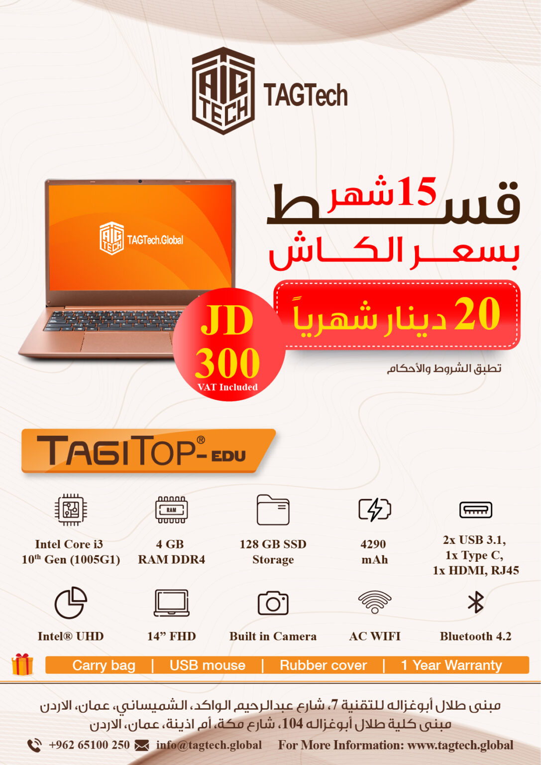 وأضاف قنيبي أن تصنيع جهاز لابتوب TAGITOP EDU جاء بأحدث المواصفات وبأسعار مناسبة جدا، بحيث يناسب جميع الاحتياجات التعليمية لطلبة المدارس والجامعات والدراسات العليا. وبين أن برنامج “التقسيط الميسّر” متاح للجميع بوجود كفيل، إما عن طريق البنوك، المؤسسات الحكومية والخاصة أو مباشرة من خلال الشركة.
