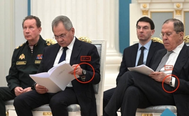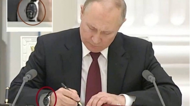 وبحسب ساعة بوتين؛ فإن توقيعه سبق اجتماع مجلس الأمن القومي الروسي؛ حيث انتبه لهذه النقطة فخلع ساعة يده ووضعها على الطاولة ولكن باقي الفريق لم يفعل ذلك وفضح المسرحية.