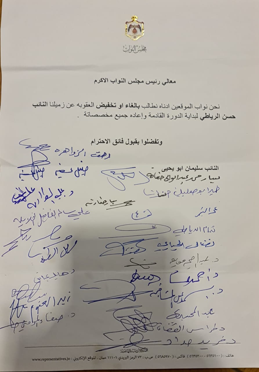 وبحسب المذكرة الموجه إلى رئيس المجلس عبدالكريم الدغمي، فإن النواب الموقعين طالبوا بإلغاء أو تخفيف العقوبة المسجلة بحق زميلهم الرياطي