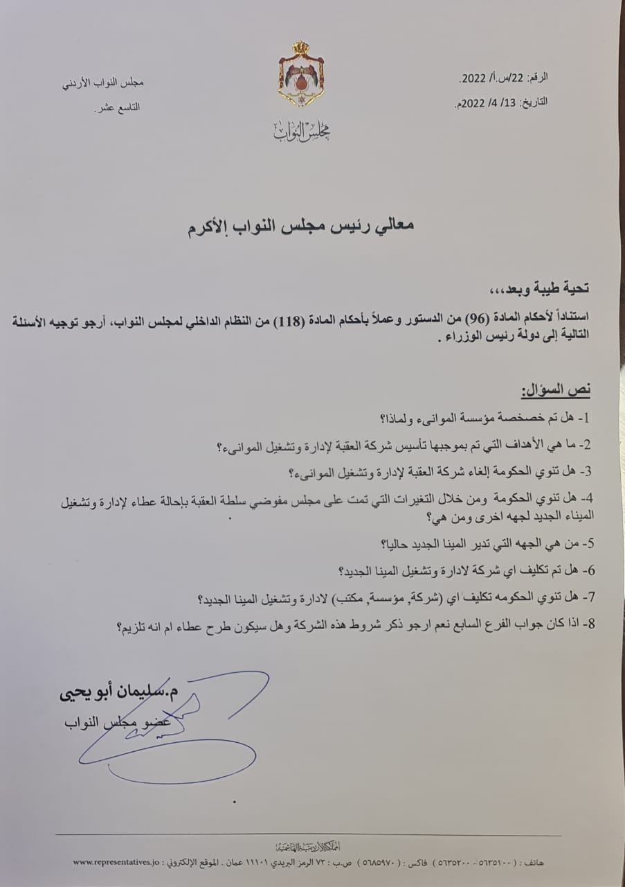 اسئله نارية من عضو مجلس النواب م. سليمان ابو يحيى موجهه الى دولة رئيس الوزراء بشر الخصاونة