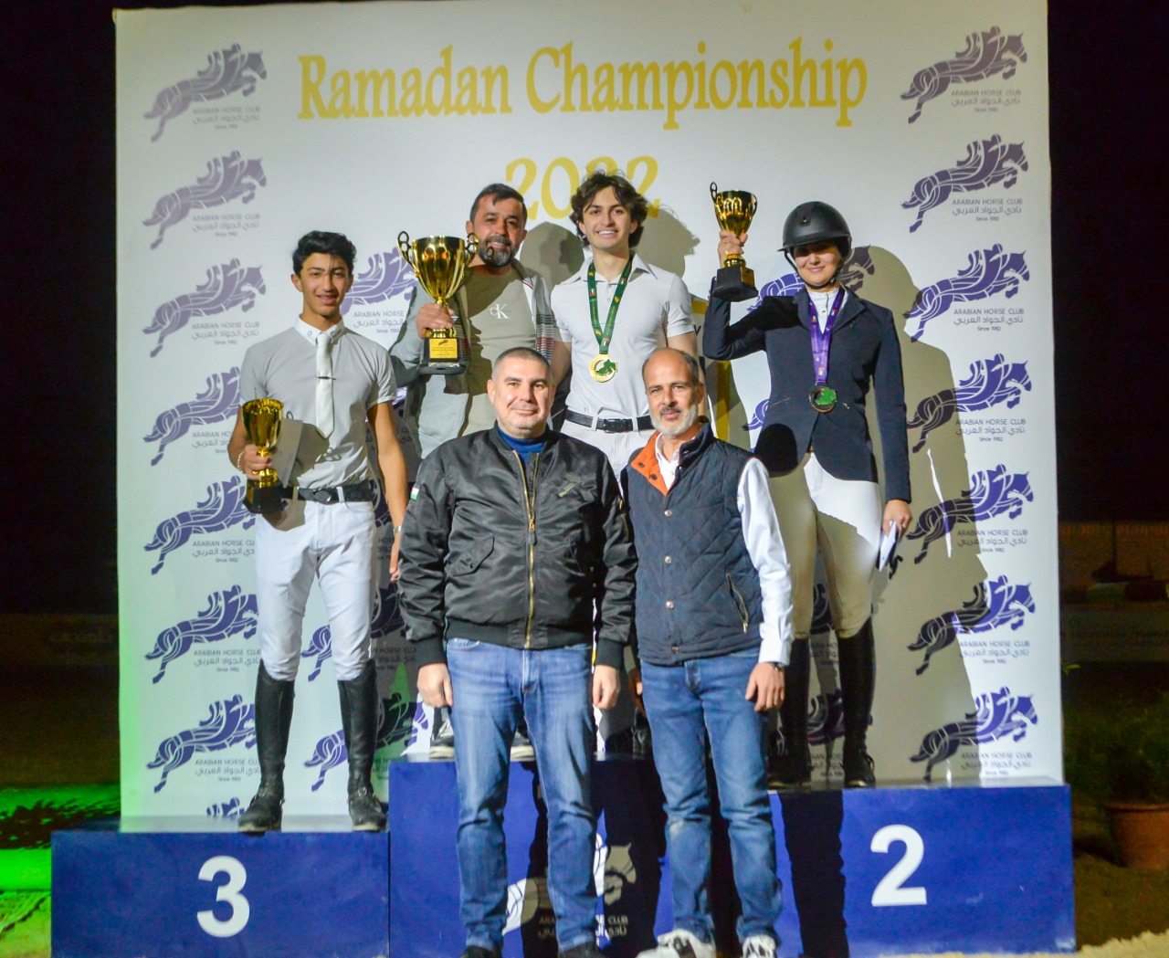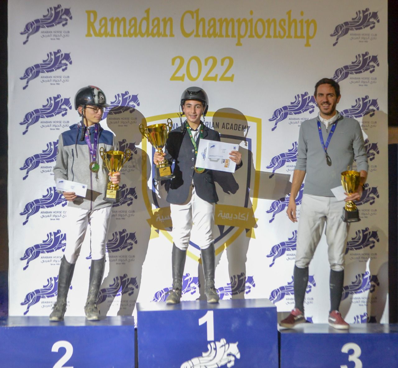 وتناوب على تتويج الفرسان احمد قريشه وكبار الحضور وسلمت الجوائز المالية المخصصة لكل فئة،وادار البطولة أحمد قريشه، والحكام الدوليين معن الحديد ونادر الحموري، ومصمم المسلك الدولي علي الدليمي وتساعده براء دعيس وحكم الإحماء صهيب ابو حماد.