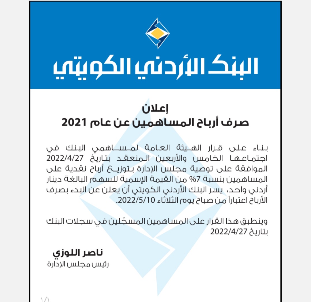 عقدت الهيئة العامة العادية لمساهمي البنك الأردني الكويتي اجتماعها الخامس والأربعين بتاريخ 27/4/2022، بواسطة وسيلة الاتصال المرئي والإلكتروني، وذلك عملاً بأحكام قانون الدفاع رقم (13) لسنة 1992 وأمر الدفاع رقم (5) لسنة 2020 المنشور في الجريدة الرسمية بتاريخ 31/3/2020 والإجراءات الصادرة عن معالي وزير الصناعة والتجارة والتموين بتاريخ 9/4/2020 بموجب أمر الدفاع أعلاه.
