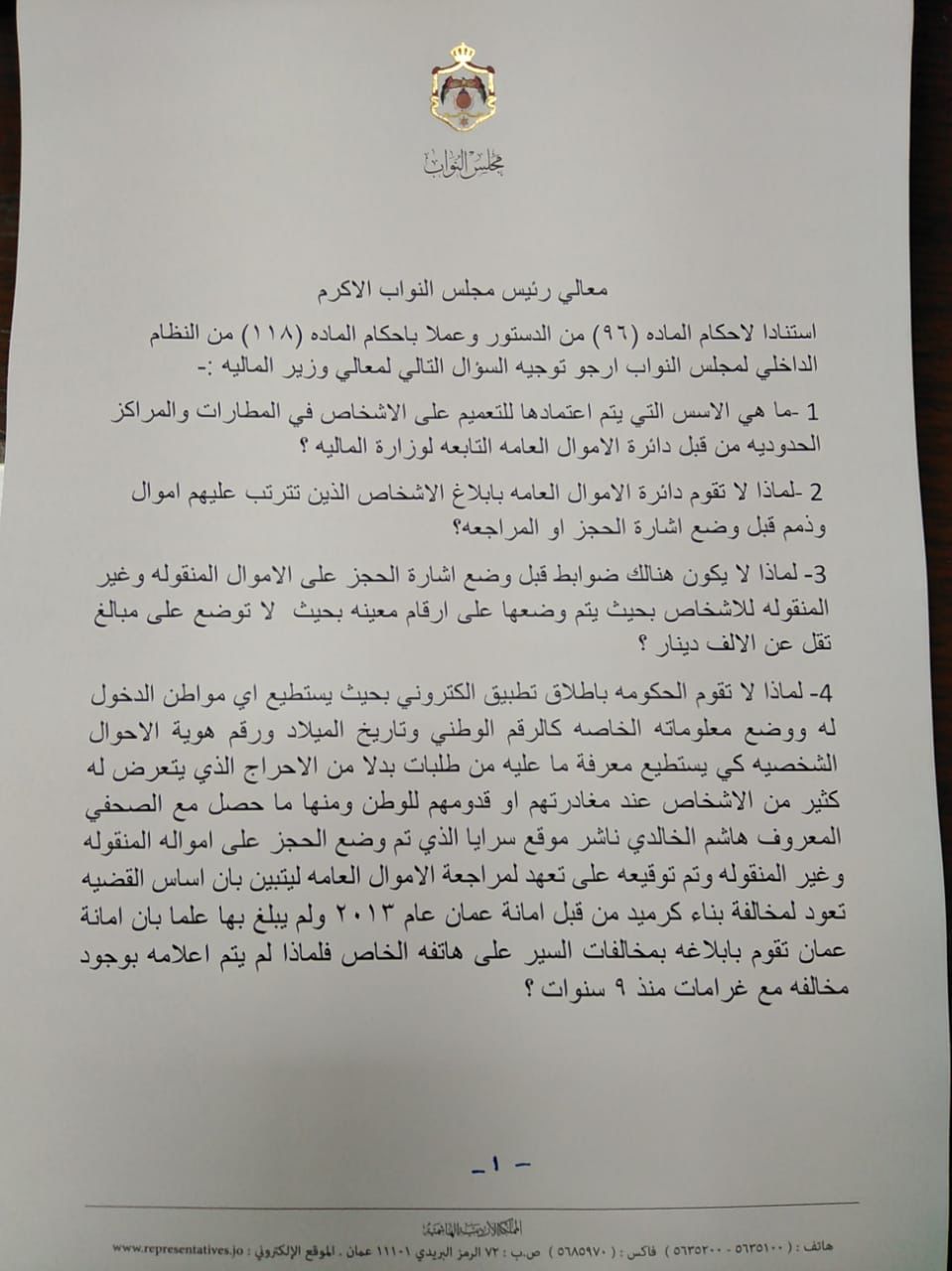 4- لماذا لا تقوم الحكومه باطلاق تطبيق الكتروني بحيث يستطيع اي مواطن الدخول له ووضع معلوماته الخاصه كالرقم الوطني وتاريخ الميلاد ورقم هوية الاحوال الشخصيه كي يستطيع معرفة ما عليه من طلبات بدلا من الاحراج الذي يتعرض له كثير من الاشخاص عند مغادرتهم او قدومهم للوطن ومنها ما حصل مع الصحفي المعروف هاشم الخالدي ناشر موقع سرايا الذي تم وضع الحجز على امواله المنقوله وغير المنقوله وتم توقيعه على تعهد لمراجعة الاموال العامه ليتبين بان اساس القضيه تعود لمخالفة بناء كرميد من قبل امانة عمان عام ٢٠١٣ ولم يبلغ بها علما بان امانة عمان تقوم بابلاغه بمخالفات السير على هاتفه الخاص فلماذا لم يتم اعلامه بوجود مخالفه مع غرامات منذ ٩ سنوات ؟