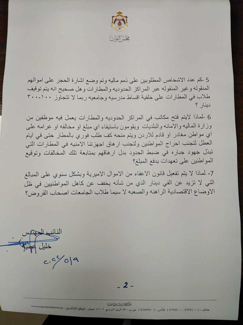 استنادا لاحكام الماده (٩٦) من الدستور وعملا باحكام الماده (١١٨) من النظام الداخلي لمجلس النواب ارجو توجيه السؤال التالي لمعالي وزير الماليه :-