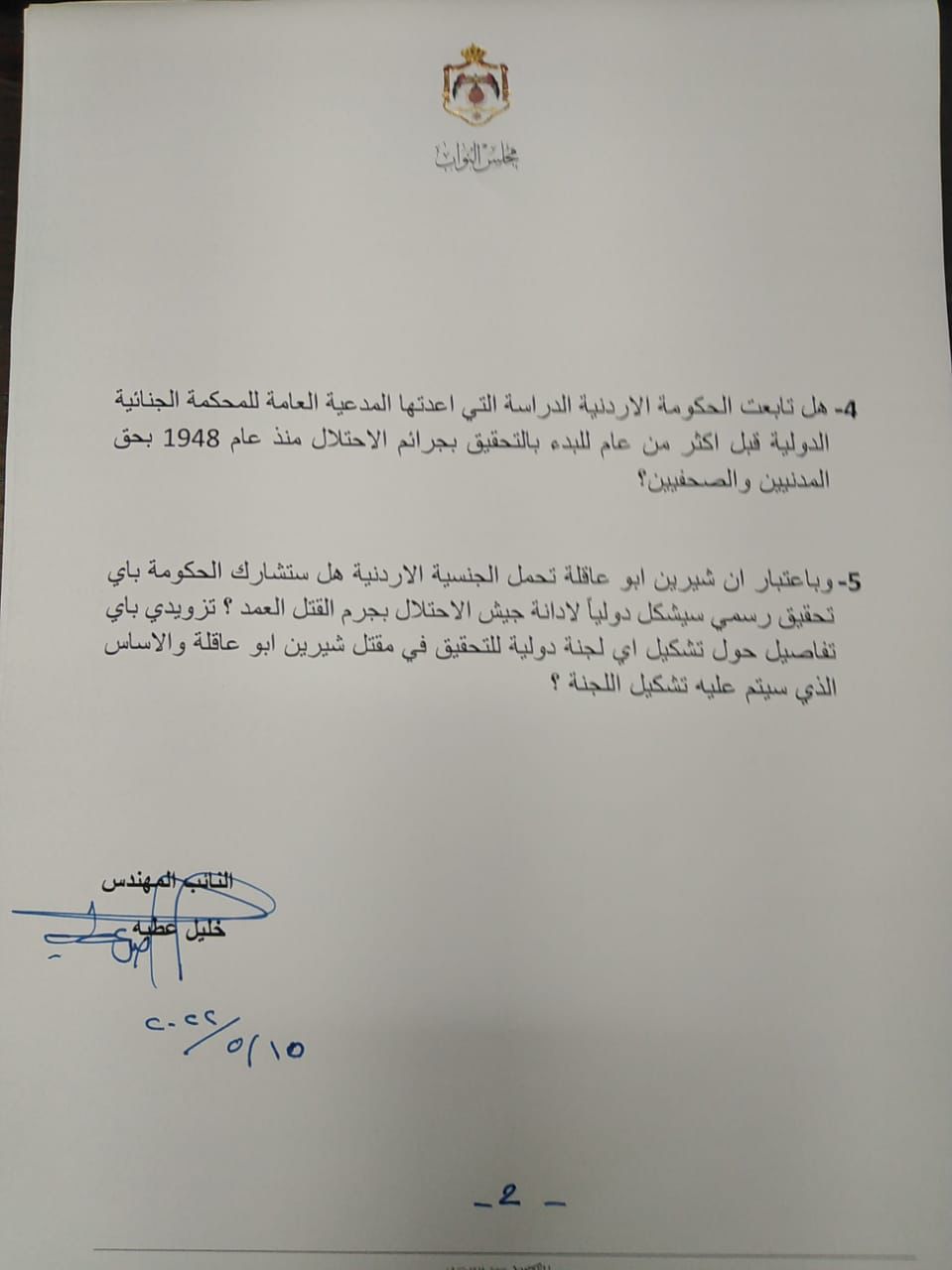 4- هل تابعت الحكومة الاردنية الدراسة التي اعدتها المدعية العامة للمحكمة الجنائية الدولية قبل اكثر من عام للبدء بالتحقيق بجرائم الاحتلال منذ عام 1948 بحق المدنيين والصحفيين؟