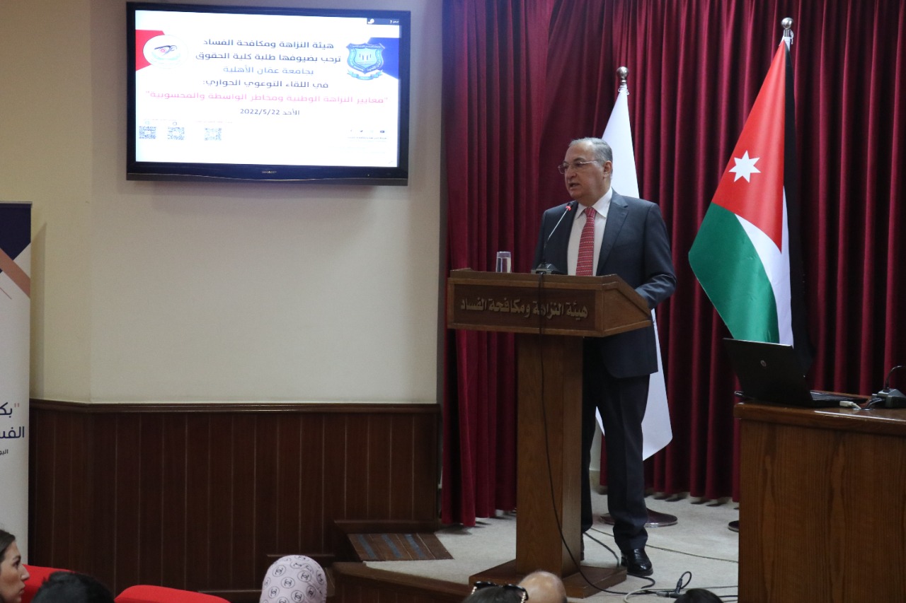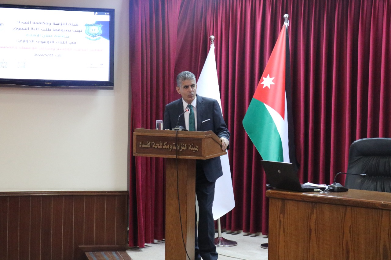 وأوضح كذلك خلال كلمته الافتتاحية في اللقاء مع الطلبة أهمية دور الجامعات في خلق حالة وعي شاملة لدى الطلبة لتأهيل جيل وطني واع وقادر على التصدي لآفة الفساد مثمناً دور طلبة الحقوق في نشر معايير النزاهة الوطنية لدى أقرانهم في المؤسسات التربوية لترسيخها والعمل بها منوهاً إلى أنهم سيصبحون زملاء المستقبل فسيكون منهم المحامي والقاضي والمستشار القانوني ، وسيقع على عاتقهم الكثير من المسؤوليات تجاه وطنهم ومجتمعهم.