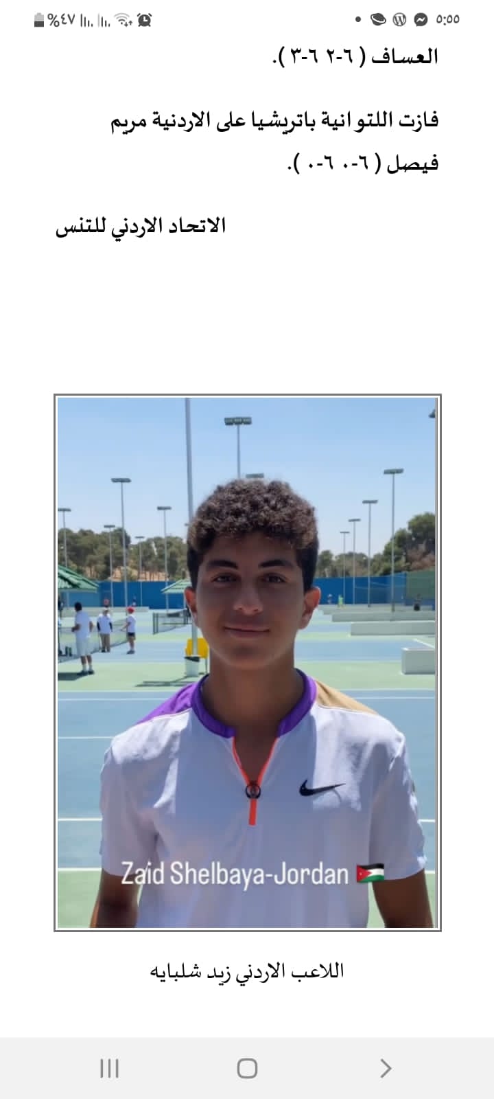 تأهل اللاعب الاردني محمد القطب للدور الثاني بعد فوزه على المصري حسن عمار ضمن فعاليات بطولة عمان الدولية للتنس للناشئين والناشئات- الدرجة الخامسة في الفردي والزوجي تحت 18 سنة بنسختها الثانية التي بدأت في تمام الساعة التاسعة من صباح اليوم الثلاثاء والتي ينظمها اتحاد اللعبة بمشاركة واسعة لـــ83 لاعب ولاعبة من 23 دولة ( هنغاريا ، ايطاليا ، مصر ، لبنان ، الهند ، كندا ، روسيا ، قبرص ، بريطانيا ، ألمانيا ، السعودية ، استراليا ، سويسرا ، لاتفيا ، تركيا ، كندا ، سوريا ، النمسا ، الكويت ، العراق ، بولندا ، بلغاريا والأردن ) وباشراف رئيس الاتحاد السيد خالد نفاع.