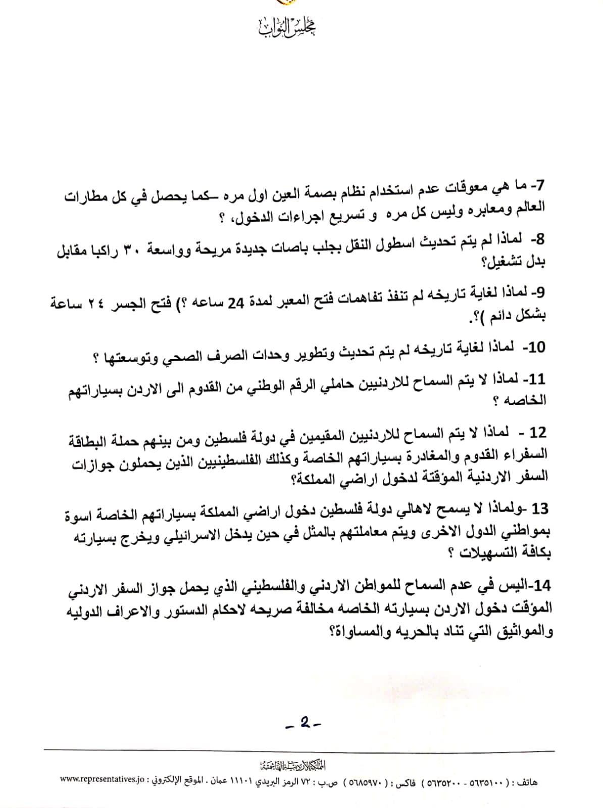 2- لماذا لايتم الغاء أو تخفيض مبلغ 10 دنانير ضريبة دخول ، والضغط على السلطه وإسرائيل لتخفيض ضريبة الخروج 158شيكل ، وتخفيض سعر المواصلات من الجسر إلى جميع مناطق الاردن لاسيما للمطار برحلات منظمة وبأسعار معقولة مع شركات القطاع الخاص ؟.