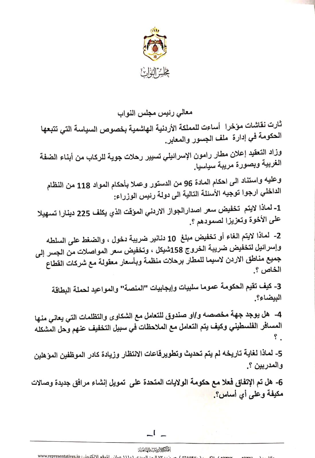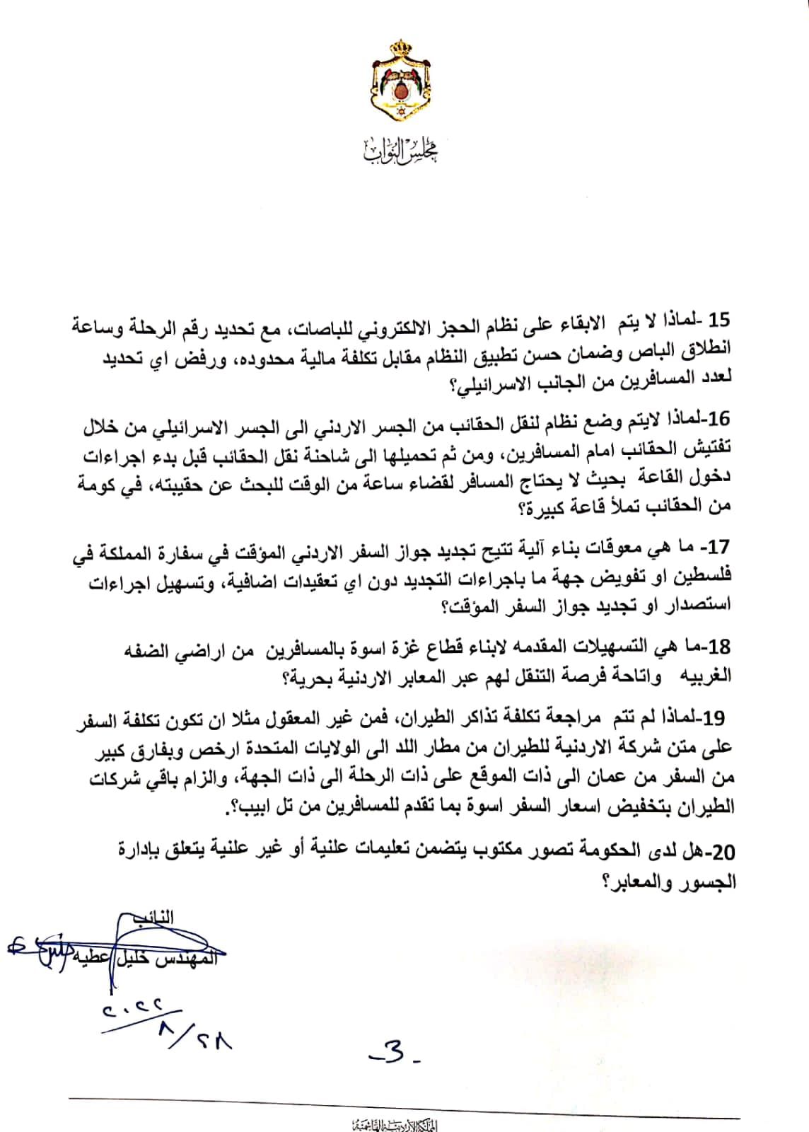 النائب عطيه : لماذا لم يتم تحديث قاعة الانتظار لجسر الملك حسين وتخفيض الضريبه للقادمين من فلسطين