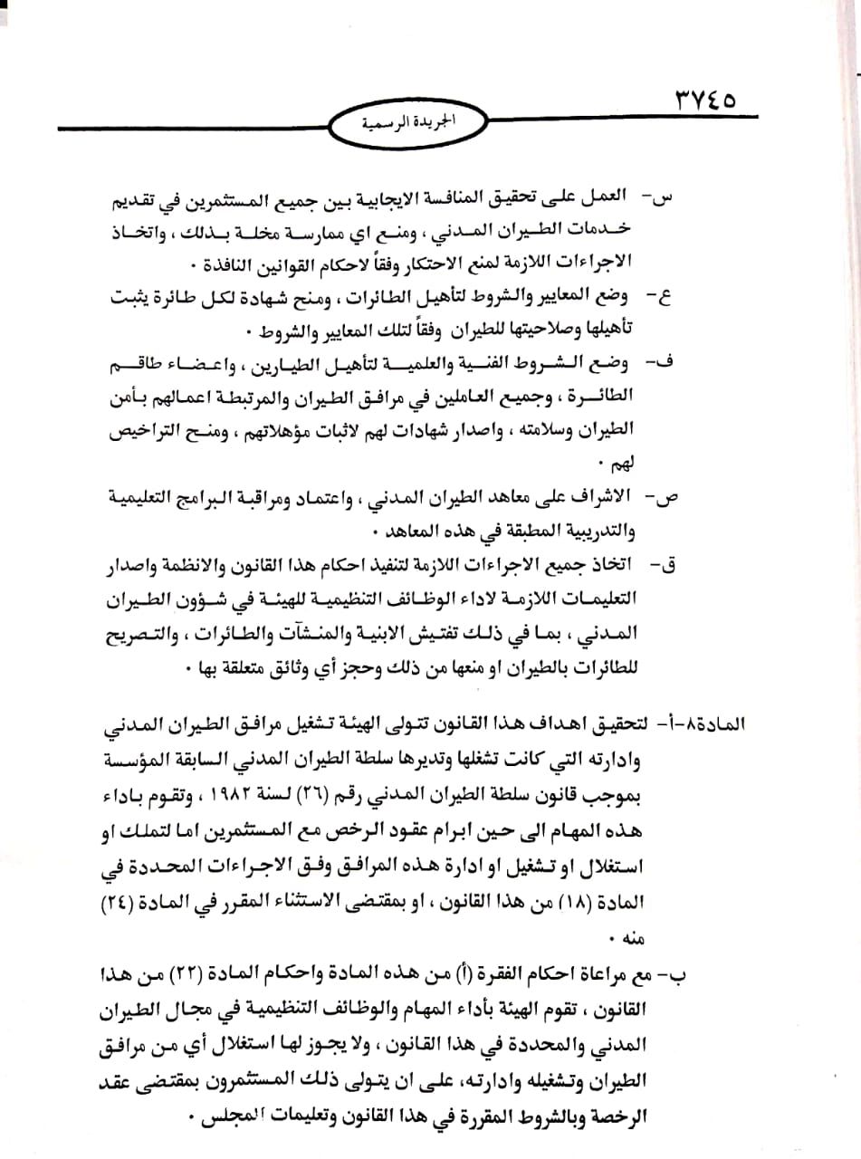 نرى ان هيئة الطيران المدني قد قصرت بشكل واضح بمتابعة واجباتها المنوطة بها والمهام والمسؤوليات المخولة لها باحكام المادة 7 من قانون الطيران المدني لسنة 2007 والمرفق صورة عنها ، وبعد اتخاذ المجلس التنفيذي لمنظمة الطيران المدني والدولي قراره في عام 2019 بالغاء مطار / رامون من خطة الملاحة الجوية للمطارات الدولية المعلنة امام واجهات الطيران الدولي ضمن ما يسمى ب ( خطة الملاحة الجوية لمنظمة اوروبا وشمال الاطلسي ) والتزام العديد من شركات الطيران الاجنبية ايقاف تشغيل الرحلات الدولية في ضوء المخاطر المتصلة بالملاحة الجوية واعتبار تشغيل المطار يشكل خرقاً لاتفاقية شيكاغو للطيران المدني لعام 1944 او ملاحقتها وتعنت سلطات الاحتلال بتسيير الرحلات والتقصير الواضح من قبل هيئة الطيران المدني باظهار هذا الالتزام من الشركات الاجنبية واستنادا لاحكام المادة (96) من الدستور وعملا باحكام المادة (126) من النظام الداخلي لمجلس النواب ارجو توجية الاستجواب التالي لدولة رئيس الوزراء الاكرم ورئيس هيئة الطيران المدني .