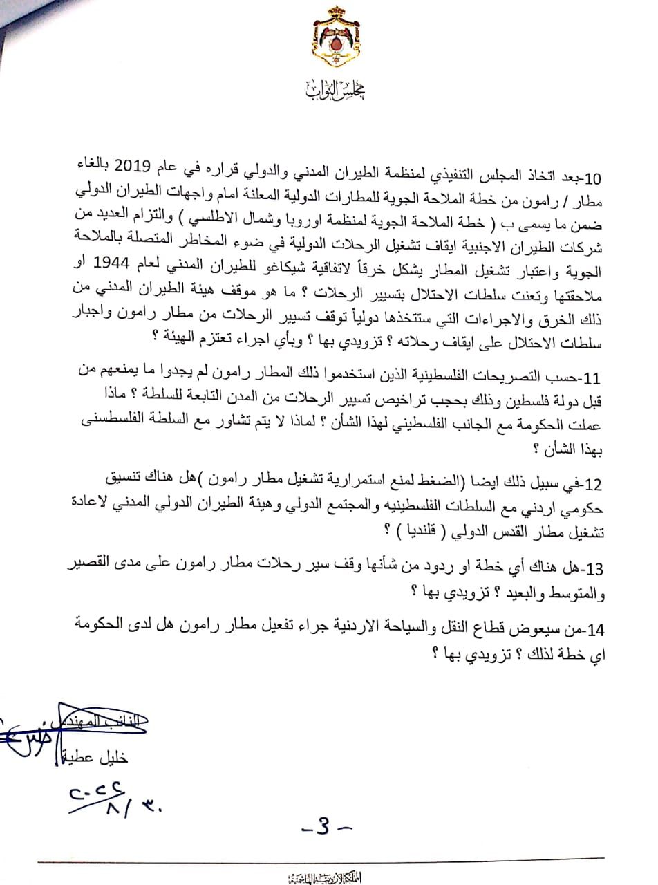 12-في سبيل ذلك ايضا (الضغط لمنع استمرارية تشغيل مطار رامون )هل هناك تنسيق حكومي اردني مع السلطات الفلسطينيه والمجتمع الدولي وهيئة الطيران الدولي المدني لاعادة تشغيل مطار القدس الدولي ( قلنديا ) ؟