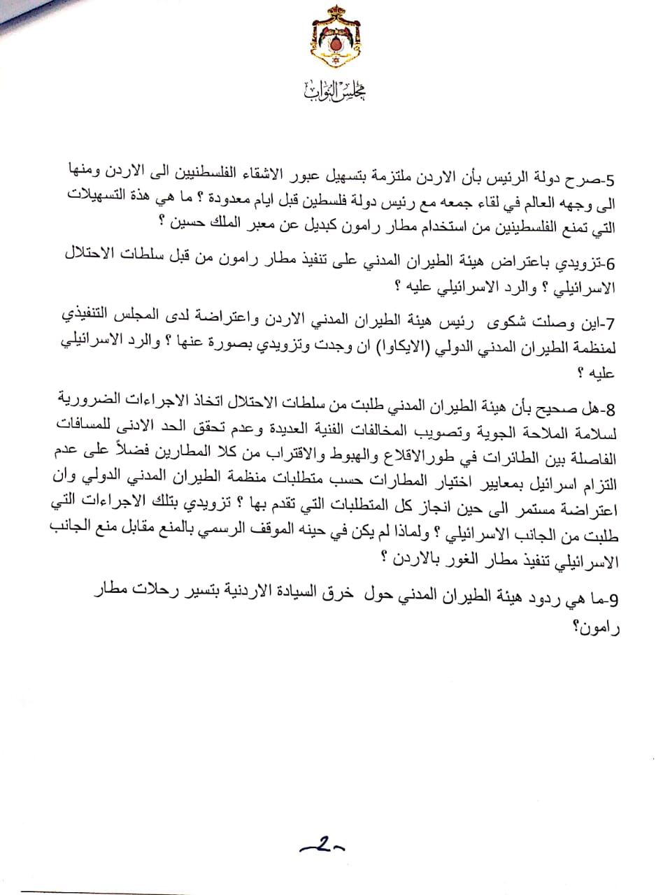 9-ما هي ردود هيئة الطيران المدني حول خرق السيادة الاردنية بتسير رحلات مطار رامون؟